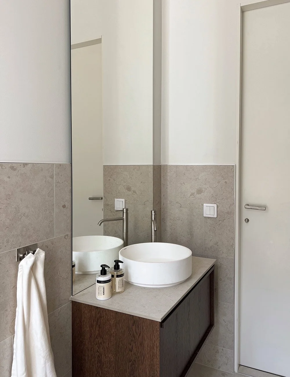 Badeværelseskommode med glatte skuffer og skjult grebsliste. Håndvask i Ölands-kalksten.