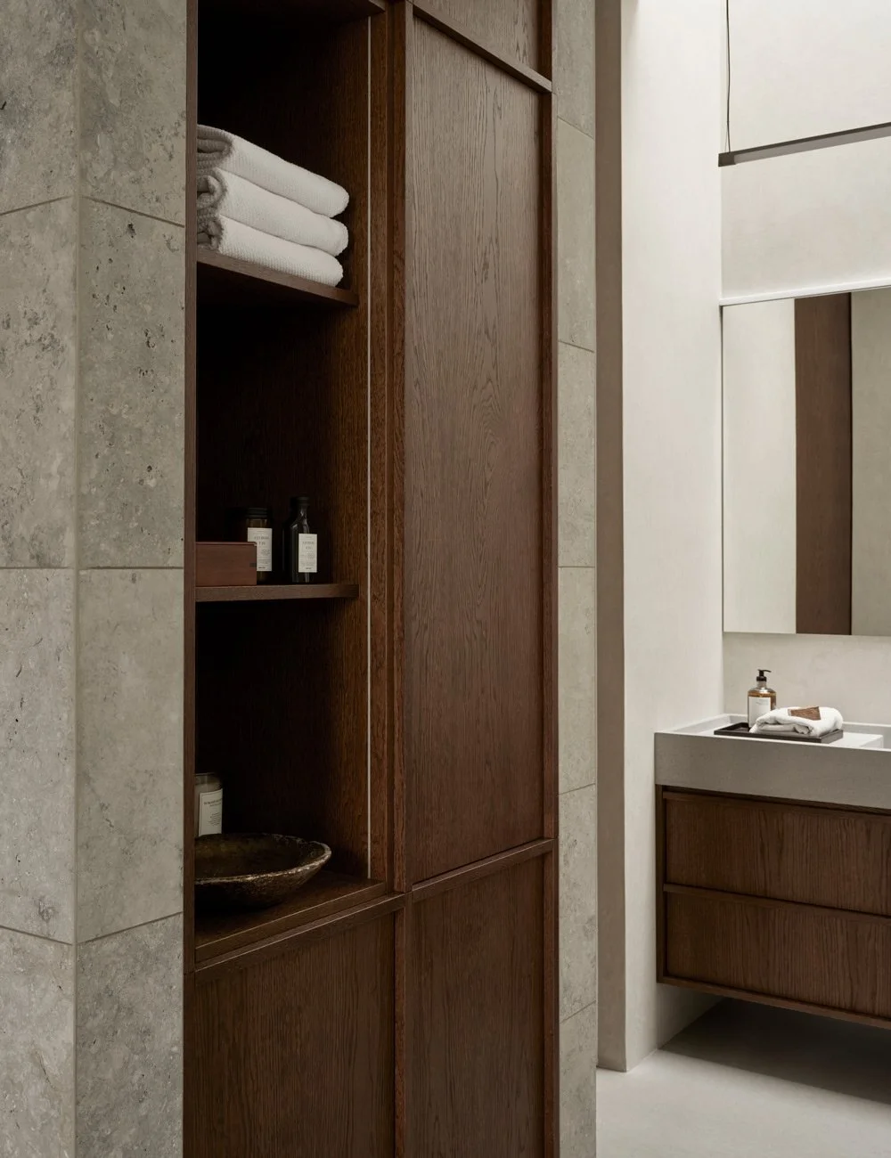 Indbygget skab og hylde, som skaber en smuk, helhedsfølelse på badeværelset.