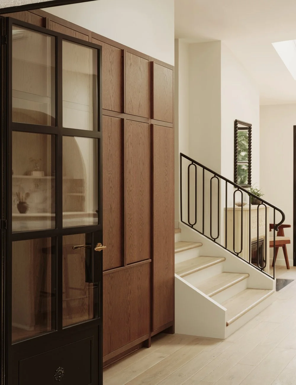 Indbyggede højskabe i mørk eg går fra gulv til loft og tilbyder generøs opbevaringsplads, samtidig med at de forstærker følelsen af rummelighed.
