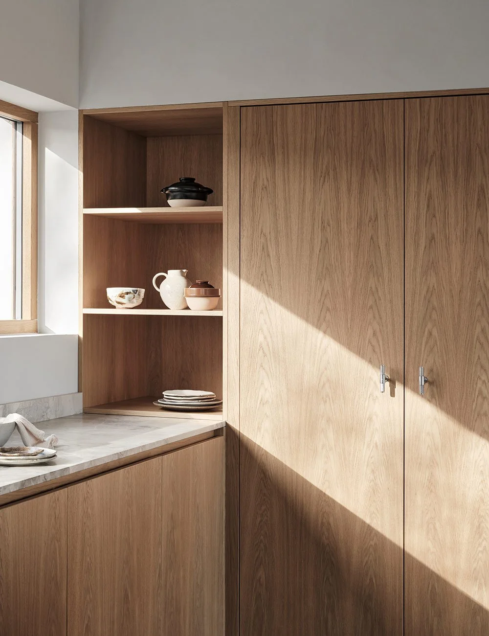 Lyst trækøkken med marmor og naturlige materialer, hvor rene linjer skaber en perfekt balance mellem rustik charme og skandinavisk design.