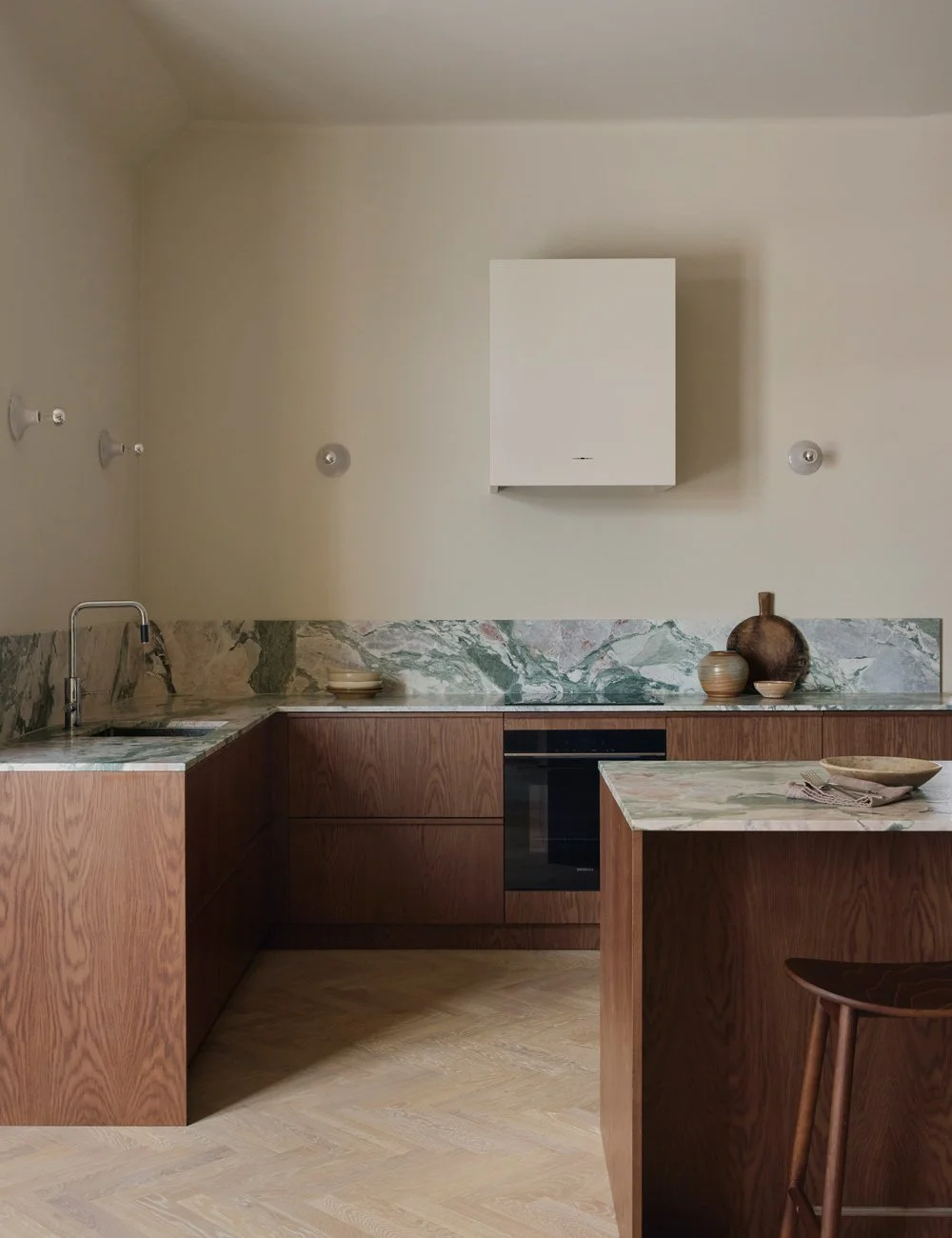 Bordpladen i marmoren ‘Four Seasons’ blev valgt for sin livlige og smukke åretegning, hvor toner af både grønt, rosa, blåt og blødt hvidt træder frem i elegant kontrast til køkkenets i øvrigt naturinspirerede, afdæmpede farver.