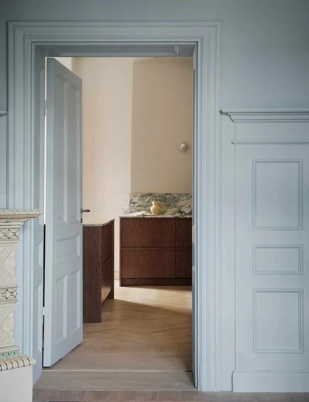 For at få farvesætningen til at hænge sammen i den store herskabslejlighed, med lange sigtelinjer mellem rummene, engagerede de indretteren og stylisten Ida Lauga, som hjalp med at udvikle en gennemtænkt farvepalette til vægge og lofter i hjemmets forskellige rum.