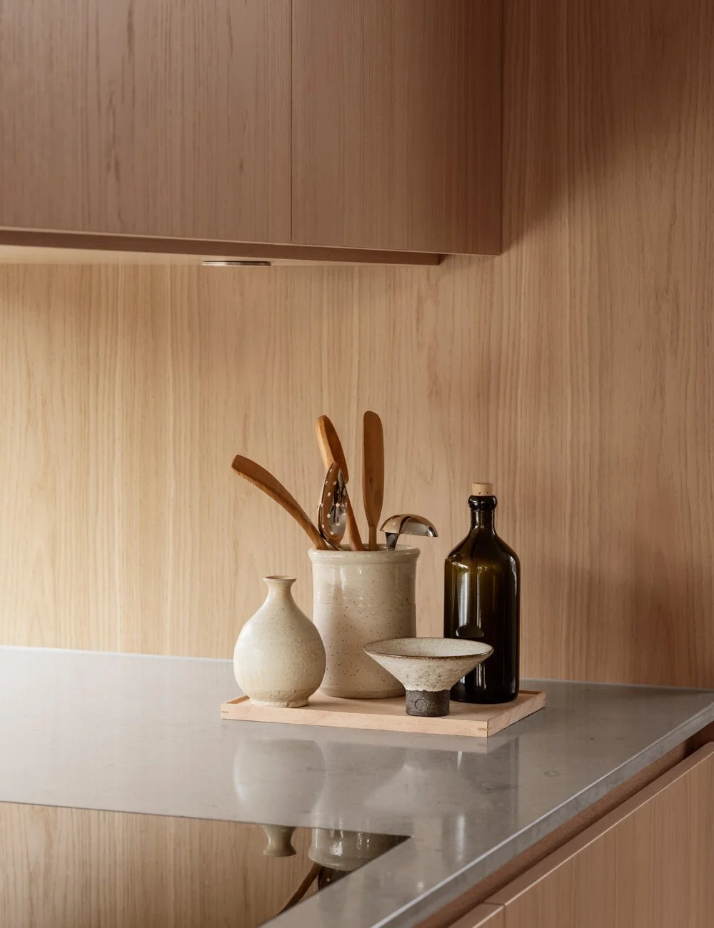 Udvalgte detaljer af japansk keramik løfter køkkenets japandi-æstetik.