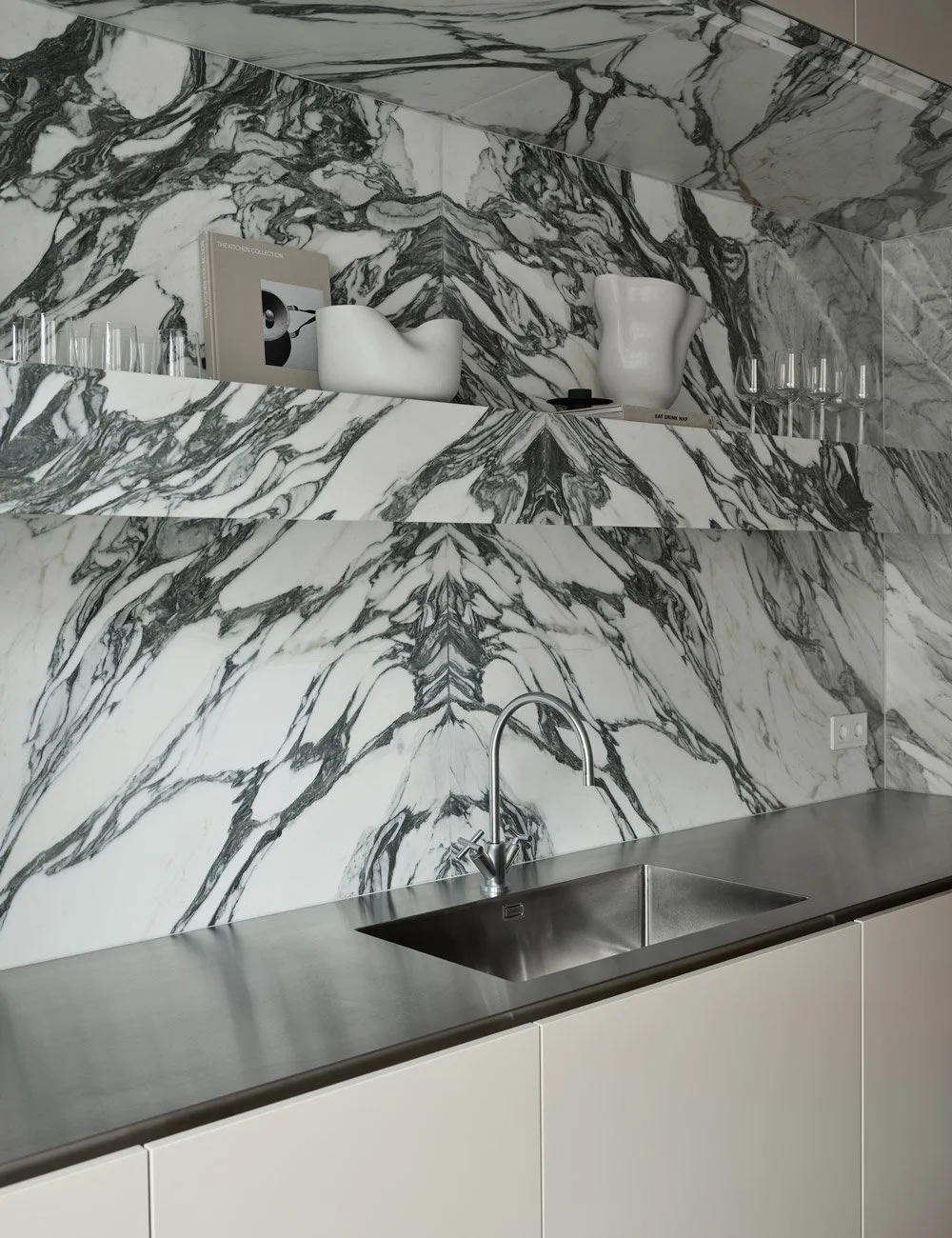 I The Statement Kitchen kontrasteres bordplade i rustfrit stål med Arabescato Corchia marmor – et møde mellem materialer, der skaber et moderne, dristigt twist med international elegance.