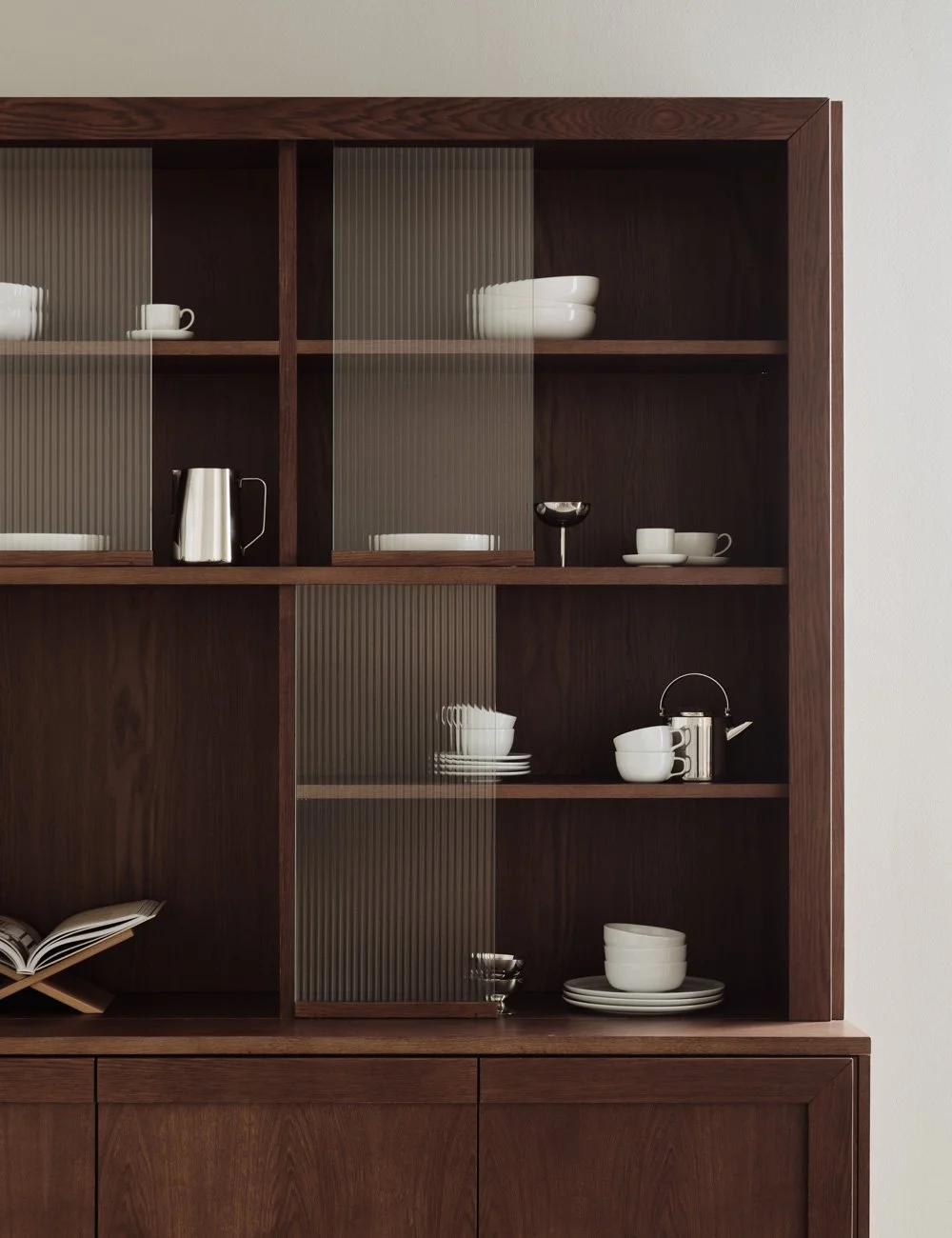 At skabe stilleben med detaljer i rustfrit stål er en let måde at skabe en rød tråd i indretningen – som her i et smukt vitrineskab i mørk eg fra Nordiska Kök.