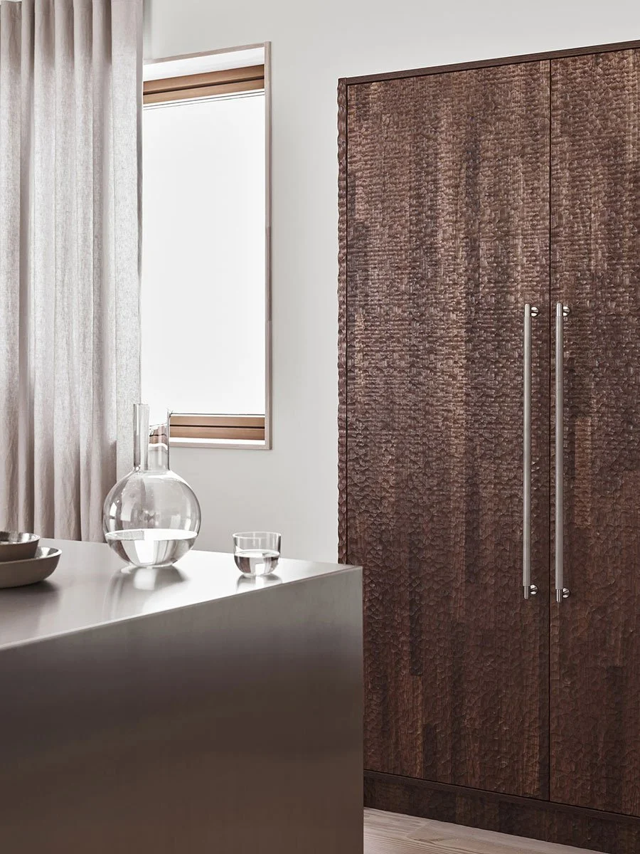 Bordpladen i rustfrit stål tilfører smuk kontrast til skuffernes varme trætoner.