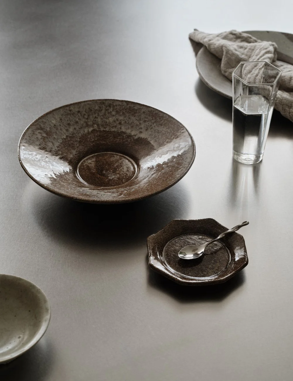 Rustfri bordplade stylet med udvalgte metalobjekter – for at forstærke det industrielle præg.