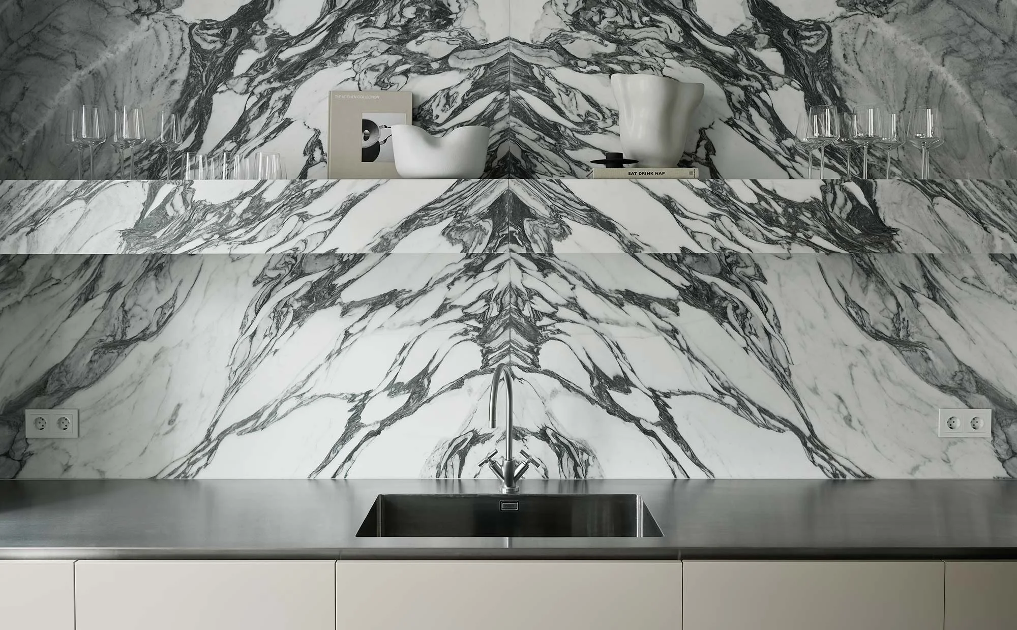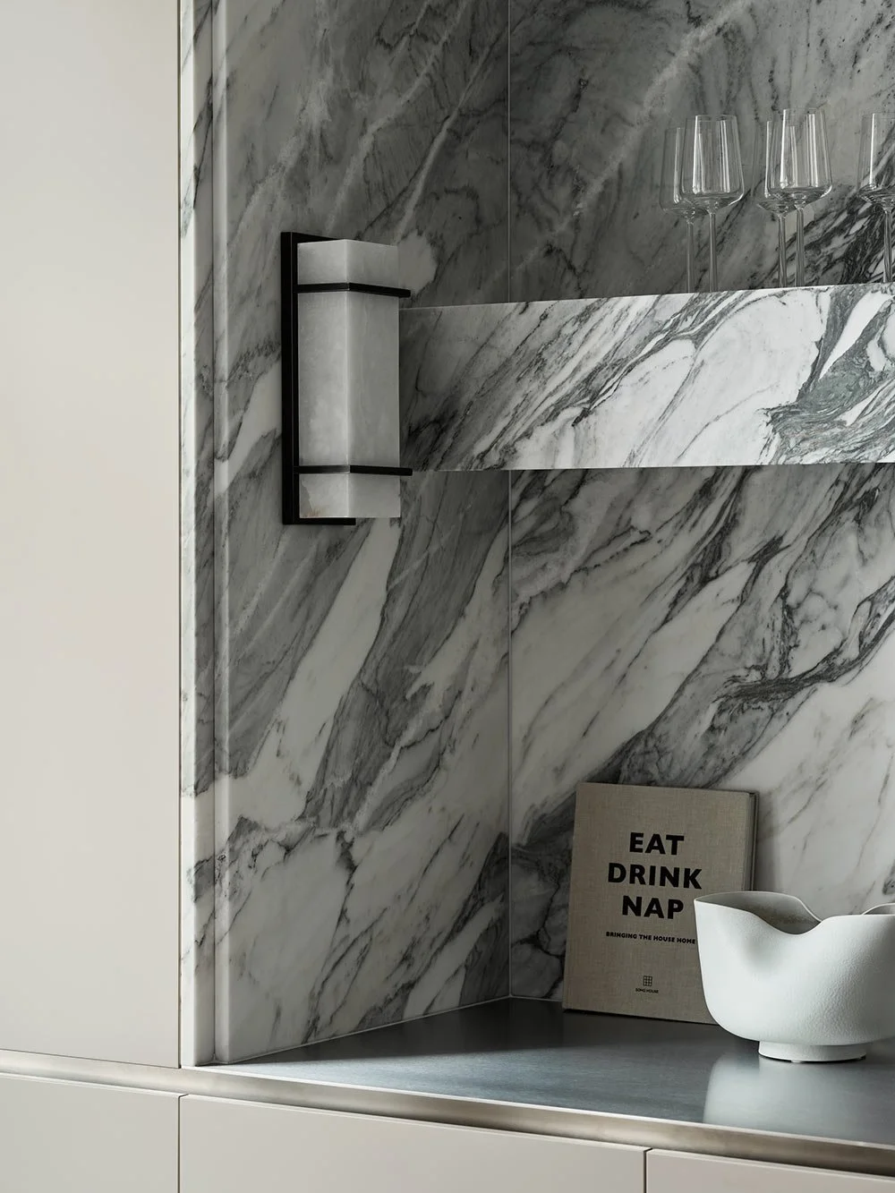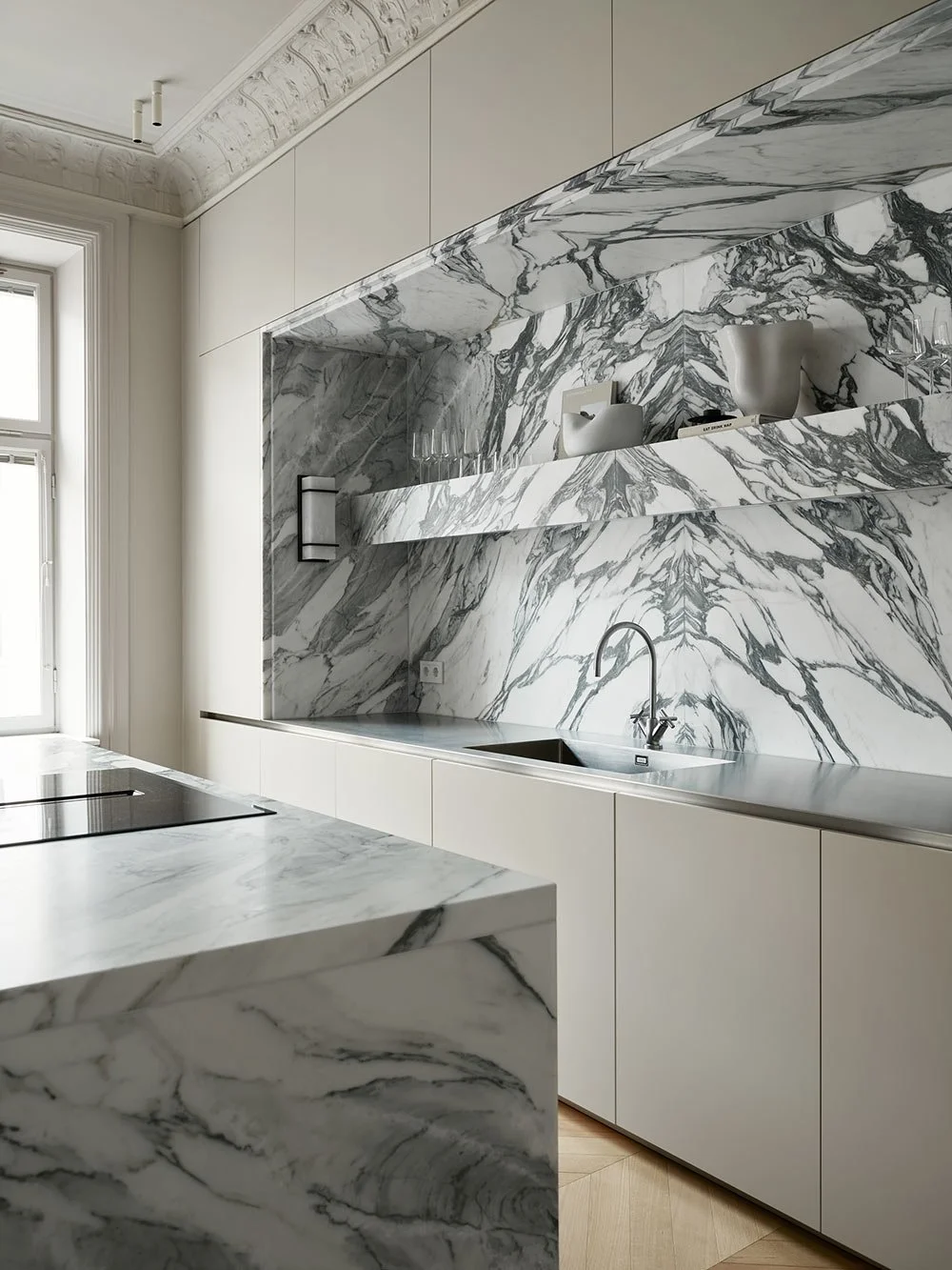 Marmoren fortsætter op ad væggen, og den robuste hylde er også lavet af den smukke Arabescato Corchia-marmor.
