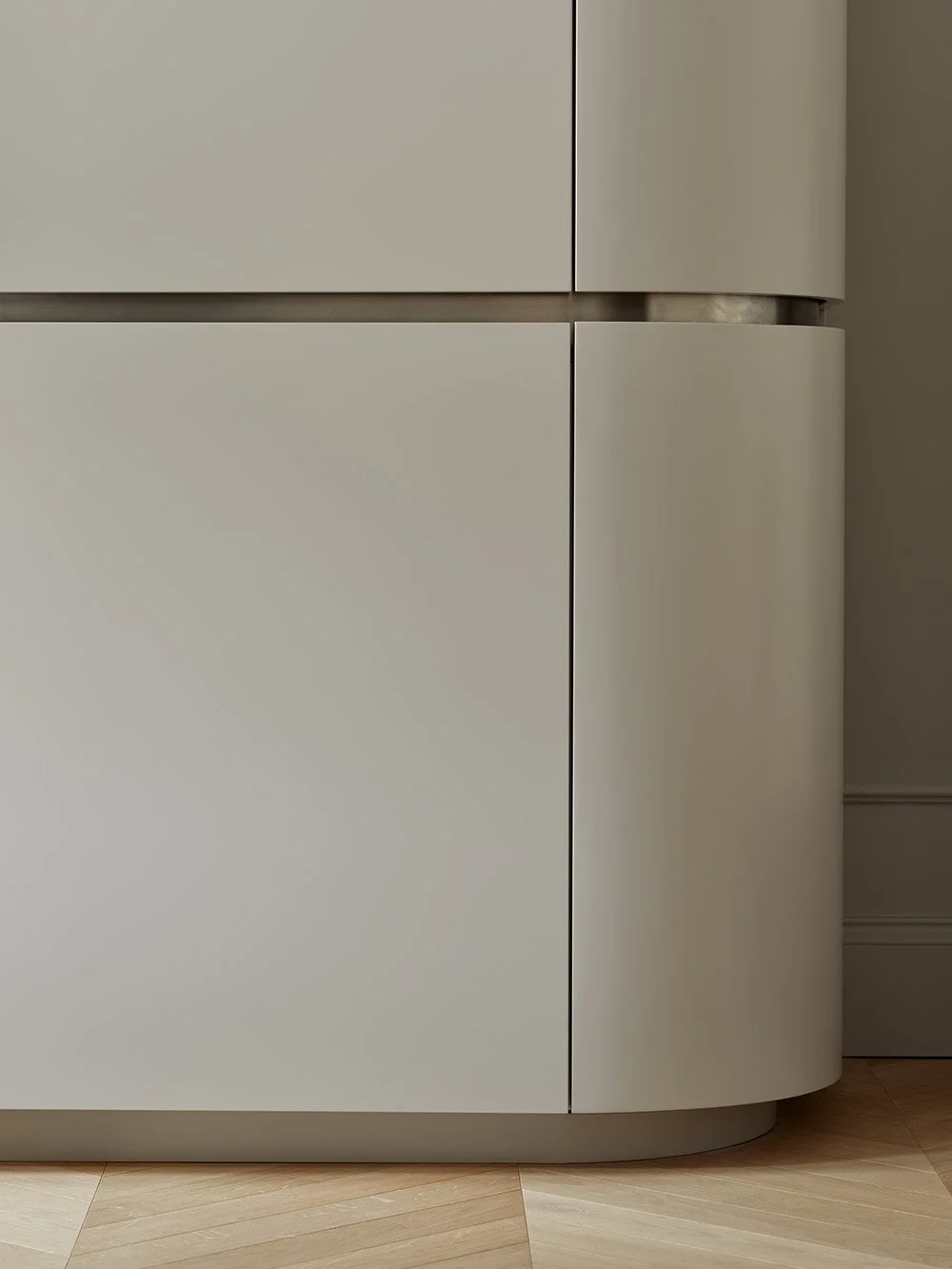 Mellem bordpladen og overskabene er der en grebsliste, hvilket giver det minimalistiske køkken et personligt og bearbejdet indtryk.