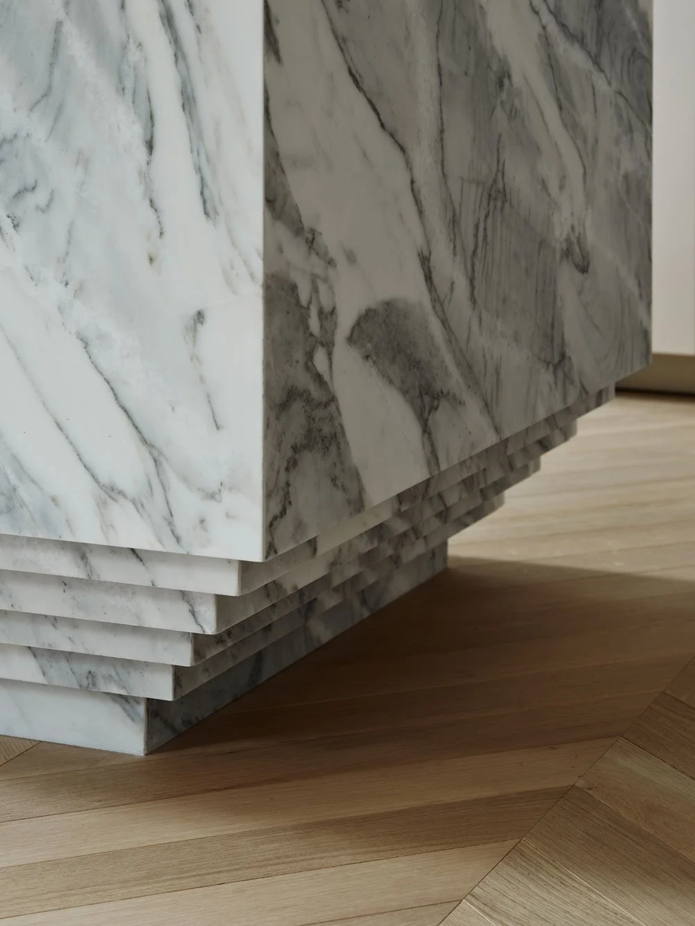 I dette køkken er det den smukke marmor, der spiller hovedrollen. Alle hvidevarer er skjult bag låger og skabe, beslag er helt fravalgt, og lågerne er glatte og malet i en harmonisk farve – på den måde bliver marmor som et kunstværk, der indrammes af det stilrene køkken. For at accentuere stenen blev siderne og "loftet" i den niche, der er indrammet af køkkenskabene, også stensat.